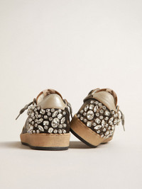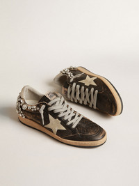 Dreaming of the Eighties. Our Ball Star sneakers have an American college vibe caught between a hoop shot and a skateboard ride. This black leather model features a sand-colored suede star and an ivory heel tab in laminated-effect nappa leather. The crystal decoration on the back and ice-gray laces add the finishing touch: beautiful things that never go out of fashion. DETAILS Item No. GWF00475.F004039.90369 - Color: black - Sand-colored suede star - Ivory heel tab in laminated-effect nappa leather - Crystal decoration on the back - Ice-gray laces - Vintage finish - Upper: 96% cow leather, 4% sheepskin leather - Lining: 59% cow leather, 34% cotton, 4% polyester, 3% textile polyurethane - Sole: 100% rubber - Handmade - Made in Italy