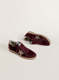 Dreaming of the Eighties. Our Ball Star sneakers have an American college vibe caught between a hoop shot and a skateboard ride. With a burgundy velvet upper accentuated by tone-on-tone suede inserts, these women's Ball Star sneakers feature a gold metallic leather star and heel tab. The burgundy laces add the finishing touch: beautiful things that never go out of fashion. DETAILS Item No. GWF00117.F007476.40533 - Burgundy velvet and suede upper - Gold metallic leather star - Gold metallic leather heel tab - Burgundy laces - Vintage finish - Upper: 21% viscose, 21% cotton, 12% polyester, 12% cuprammonium rayon, 8% sheepskin leather - Lining: 34% cotton, 31% cow leather, 7% viscose, 4% polyester - Sole: 100% rubber - Handmade - Made in Italy