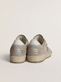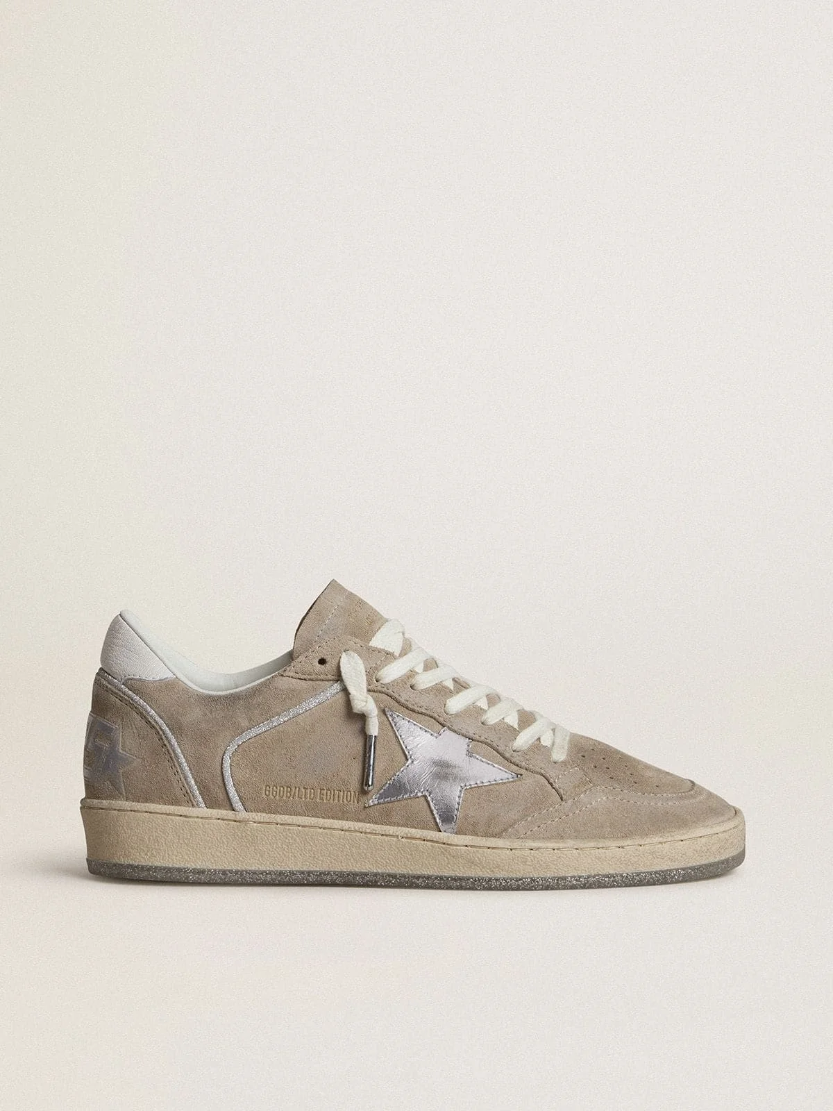 Dreaming of the Eighties. Our Ball Star sneakers have an American college vibe caught between a hoop shot and a skateboard ride. Like this model crafted in beige suede, featuring a silver metallic leather star and a white leather heel tab. The silver glitter inserts, white laces and Sneakers lettering on the heel in a silver heavy metal font add the finishing touch. DETAILS Item No. GWF00327.F007265.15261 - Beige suede upper - Silver metallic leather star - White leather heel tab - Sneakers lettering on the heel in a silver heavy metal font - Silver glitter inserts - White laces - Vintage finish - Upper: 61% cow leather, 21% textile polyurethane, 10% polyester, 4% sheepskin leather, 4% polyamide - Lining: 34% cotton, 31% cow leather, 24% textile polyurethane, 7% viscose, 4% polyester - Sole: 100% rubber - Handmade - Made in Italy
