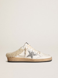Dreaming of the Eighties. Our Ball Star sneakers have an American college vibe and a feeling of the basketball scene around at the time. Lined in soft beige shearling, this sabot version features a white nappa leather upper accentuated with a silver glitter star. The cream laces add the finishing touch: beautiful things that never go out of fashion. DETAILS Item No. GWF00436.F003988.10224 - White nappa leather upper - Silver glitter star - Cream laces - Vintage finish - Upper: 97% sheepskin leather, 2% polyethylene terephthalate, 1% cotton - Lining: 37% sheepskin leather, 33% cow leather, 30% cotton - Sole: 100% rubber - Handmade - Made in Italy