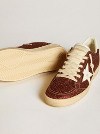 Dreaming of the Eighties. Our Ball Star sneakers have an American college vibe caught between a hoop shot and a skateboard ride. This model with a burgundy glitter upper features a white leather star and heel tab. The striped-effect cream nylon tongue and cream-colored laces add the finishing touch: beautiful things that never go out of fashion. DETAILS Item No. GWF00117.F006527.40510 - Burgundy glitter upper - White leather star - White leather heel tab - Cream nylon tongue with striped effect - Cream-colored laces - Vintage finish - Upper: 67% polyester, 25% cotton, 7% cow leather, 1% textile polyurethane - Lining: 34% cotton, 31% cow leather, 24% textile polyurethane, 7% viscose, 4% polyester - Sole: 100% rubber - Handmade - Made in Italy
