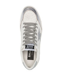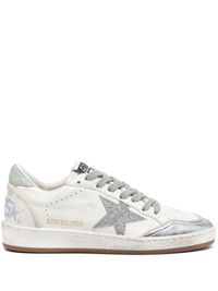 Ballstar glittered leather sneakers Golden Goose returns to American university campuses in the 80s, where basketball and skateboarding were popular. The result is the Ball Star sneakers, inspired by both sports and designed for everyday wear. The pair is finished with a distressed lived-in look, as is signature of the brand. Highlights - White/silver-tone - Calf leather - Smooth grain - Distressed effect - Round toe - Perforated toebox - Signature star patch to the sides - Glitter detailing - Gold-tone logo lettering to the side - Perforated detailing to the sides - Logo patch at the tongue - Logo print to the rear - Contrasting heel counter - Padded ankle - Branded leather insole - French terry lining - Flat rubber sole - Contrasting front lace-up fastening - This piece comes complete with a protective dust bag. Made in Italy Composition Leather 100% SIZE & FIT Measurement HEEL 1.18 in(3 cm) Sole height 0.78 in(2 cm)