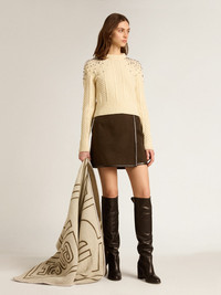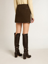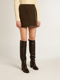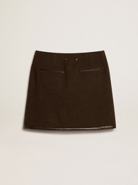 An ode to Venice, our home, seen with the eyes of those dreamers who live it every day. This Journey Collection explores the city of our roots, drawing inspiration from the people who inhabit it. Different, iconic places now discovered through the life of its lovers. This compact-wool miniskirt features leather details around the opening and the lower hem. DETAILS Item No. GWP01505.P001167.35856 - Journey Collection - Color: bark - Wraparound model - Two back pockets - Double star on the back - Concealed press studs on the front - Main material: 100% wool - Made in Italy The model is 177 cm tall and is wearing a size 40.
