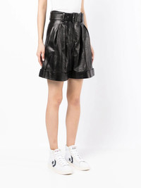 belted wide-leg shorts black crinkled finish star stud detailing wide leg high waist belted waist two side slit pockets two rear welt pockets turn-up cuffs Made in Italy Composition Body: Polyester 100% SIZE & FIT Model measurements Height 5 ft 10 in(1.78 m) Bust/Chest 33.07 in(84 cm) Hips 33.85 in(86 cm) Waist 25.19 in(64 cm) Measurement FRONT RISE 14.17 in(36 cm) INSIDE LEG 7.08 in(18 cm) HIPS 36.22 in(92 cm) FittingInformation This piece fits true to size. We recommend you get your regular size Designed to be fitted at the waist, loose over the leg Made with a mid-weight non-stretch fabric Washing instructions Dry Clean Only