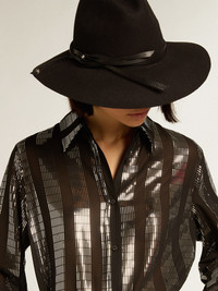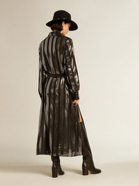 An ode to Venice, our home, seen with the eyes of those dreamers who live it every day. This Journey Collection explores the city of our roots, drawing inspiration from the people who inhabit it. Different, iconic places now discovered through the life of its lovers. This black georgette shirt dress features small shiny rectangles arranged to create a pinstripe pattern. DETAILS Item No. GWP01482.P001268.90100 - Journey Collection - Color: black - Tone-on-tone waist belt - Double gold star on the back - Long sleeves - Side slits - Button fastening - Main material: 100% polyester - Made in Italy The model is 177 cm tall and is wearing a size 40.