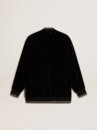 An ode to Venice, our home, seen with the eyes of those dreamers who live it every day. This Journey Collection explores the city of our roots, drawing inspiration from the people who inhabit it. Different, iconic places now discovered through the life of its lovers. This black jacket in soft viscose and silk-blend velvet features extremely delicate floral hand embroidery on the front, with a 3D effect. As a finishing touch, the embroidery around the neckline, hem and cuffs gives the garment versatility as it may be worn as a cardigan over a shirt, or as a top. DETAILS Item No. GWP01335.P001160.90100 - Journey Collection - Color: black - White floral embroidery - Double star on the back - Two pockets - Elasticated edging - Button fastening - Main material: 82% viscose, 18% silk - Made in Italy The model is 177 cm tall and is wearing a size 40 (IT).