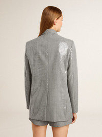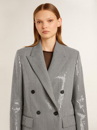 Inspired by the electric energy of the Nineties, the collection celebrates the limitless power of shared dreams. Moved by passion, each design captures the meaning of togetherness and the power of music. This double-breasted wool jacket in micro houndstooth features all-over embroidered silver sequins. The six-button closure and inner lining with logo add the finishing touch. DETAILS Item No. GWP02265.P001939.82600 - Journey Collection - Color: silver - Boyfriend fit - Double-breasted - All-over sequins - Two front pockets - Buttons and logoed inner lining - Main material: 70% viscose, 30% virgin wool - Lapel material: 100% virgin wool - Undercollar: 70% virgin wool, 30% viscose - Lining material: 100% viscose - Made in Italy The model is 177 cm tall and is wearing a size 40.