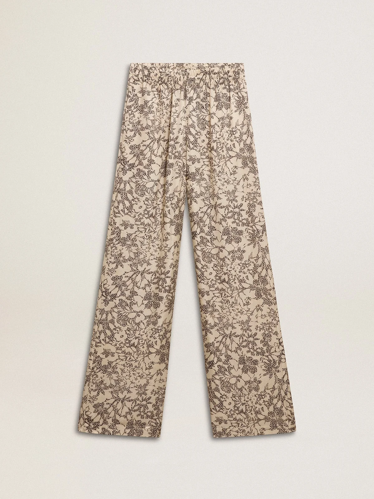 A collection inspired by the harmony of nature, where every detail flows with ease. In a silk blend, these joggers feature a floral print. The elasticated waistband adds the finishing touch. DETAILS Item No. GWP00821.P001913.15676 - Journey Collection - Color: beige and black - Regular fit - Floral print - Double star on the back - Elasticated waistband - Main material: 75% viscose, 25% silk - Made in Italy The model is 177 cm tall and is wearing a size 40.