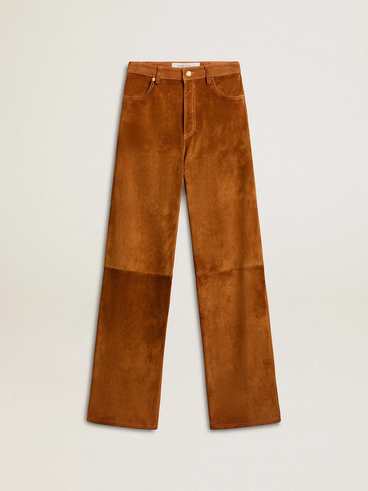 A love story to our home, Marghera. Where everything began. Our latest collection reflects the spirit of our birthplace, its contrasts, industrial soul, and manufacturing landscapes, weaving together inspirations from both the vibrant energy of workwear and the refined essence of traditional tailoring. These women's pants in split leather with corduroy-effect laser detailing feature a straight leg and antique gold finishes. DETAILS Item No. GWP01882.P001670.55194 - Journey Collection - Color: tobacco - Double star on the back - Regular fit - Four pockets - Fastening with antique gold button - Main material: 100% cow leather - Contrasting material: 100% cow leather - Lining material: 100% viscose - Pocket lining: 100% cotton - Made in Italy The model is 177 cm tall and is wearing a size 40.