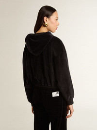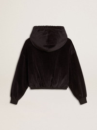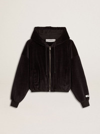 The third drop in our Fall/Winter 25 collection channels the funky glamor of the 1970s, a time when the night transformed into a canvas for unapologetic self-expression. In a velvet-effect black cotton blend, this women's sweatshirt features a bomber fit and a metal zip fastening. The label on the elasticated cuff and hood add the finishing touch. DETAILS Item No. GWP02327.P002130.90100 - Journey Collection - Color: black - Bomber fit - Metallic zip fastening - Applique label - Elasticated cuffs - With hood - Main material: 79% cotton, 21% polyester - Lining material: 100% cotton - Made in Italy The model is 177 cm tall and is wearing a size S.