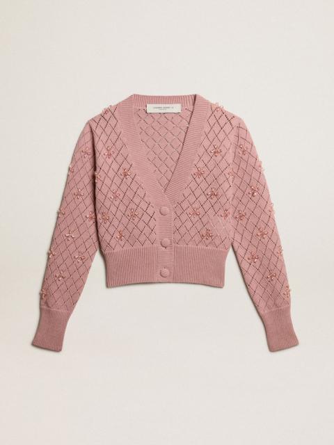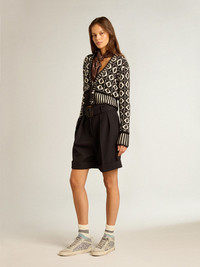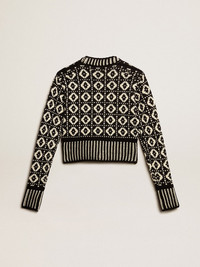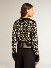 From Venice, our home, to Paris, our dream. This Journey Collection captures the essence and beauty of everyday moments in the City of Lights, immersed in a mesmerizing atmosphere where intimacy, authenticity and curiosity are the pulsating soul of it. This cropped-fit cardigan in pure wool blends vintage white and black in a jacquard weave to create a 3D-effect, soft-touch design. DETAILS Item No. GWP01169.P001459.82556 - Journey Collection - Color: vintage white and black - All-over geometric design - Double star on the back - Button fastening - Long sleeves - Cropped fit - Main material: 100% wool - Rib material: 100% wool - Made in Italy The model is 177 cm tall and is wearing a size S.