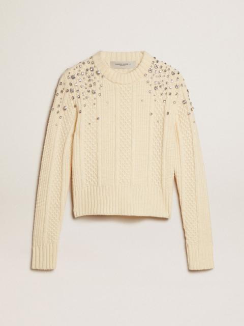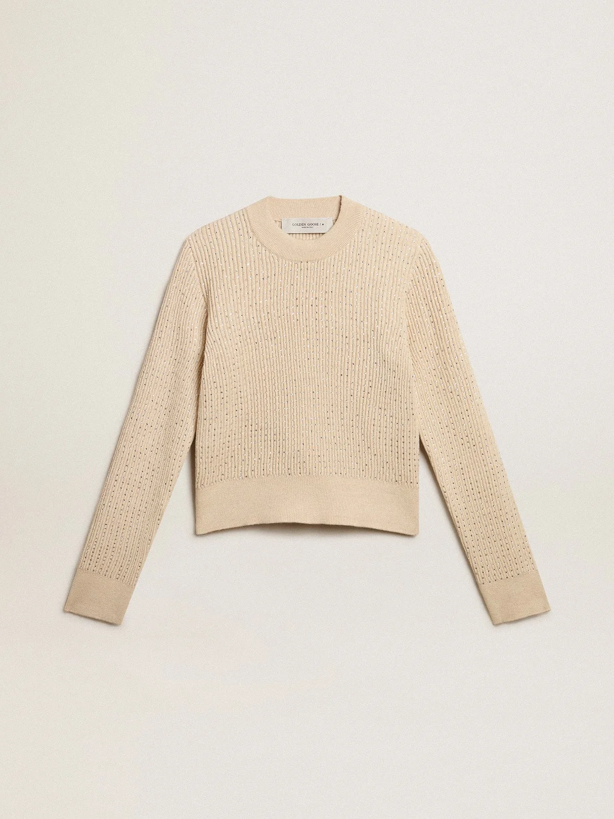 Cropped round-neck sweater in beige wool with all-over crystals
