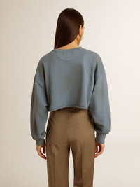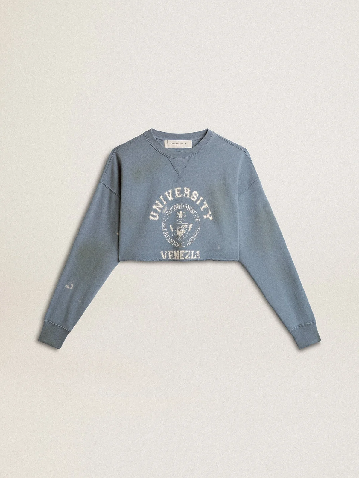 A love story to our home, Marghera. Where everything began. Our latest collection reflects the spirit of our birthplace, its contrasts, industrial soul, and manufacturing landscapes, weaving together inspirations from both the vibrant energy of workwear and the refined essence of traditional tailoring. In baby blue and inspired by American college style, this women's cropped sweatshirt features a distressed finish. The vintage “University of Venice” print, spraying detail and white distressing on the collar and cuffs make this sweatshirt a true one-of-a-kind. DETAILS Item No. GWP01787.P001631.50877 - Journey Collection - Color: baby blue - Double star on the back - Cropped fit - White vintage logo in water-based print on the front - Distressed finish - Main material: 100% cotton - Made in Italy The model is 177 cm tall and is wearing a size S.