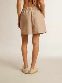 Driven by the essence of sun-drenched days by the sea, the Resort Collection captures the retro-inspired vibrance of summer spent in lustful oasis lustful that breathes carefreeness into each garment. A jacquard fabric in a blend of wool and viscose has been selected for these women's dark beige shorts with a regular fit. The garment features a pocket on the back and two side pockets. The elasticated waist adds even more comfort as the finishing touch. DETAILS Item No. GWP02046.P001687.55156 - Resort Collection - Color: dark beige - Two pockets on the front - Double star on the back - Back pocket - Elasticated waist - Regular fit - Main material: 54% viscose, 46% wool - Handmade - Made in Italy The model is 177 cm tall and is wearing a size 40.