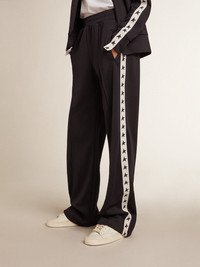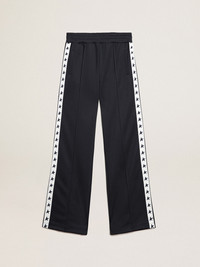 A collection with a casual soul but a versatile attitude: inspired by the Seventies, it has a timeless vintage appeal, suited to any occasion or look. Inspired by the world of tailoring, echoed by the stitched pleat on the front, these women’s joggers in dark blue technical jersey feature a wide leg. The white strip on the sides of the legs with contrasting blue stars adds the finishing touch. DETAILS Item No. GWP00877.P000521.50767 - Star Collection - Color: dark blue - Wide leg - Two pockets - White grosgrain strip on the sides with contrasting blue stars - Main material: 100% polyester - Pocket material: 100% cotton - Made in Italy The model is 177 cm tall and is wearing a size S.