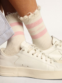The must-have accessory for a total Golden look. These papyrus-white socks feature a deep welt with distressed finish and baby-pink striped logo. DETAILS Item No. GUP00883.P000487.81698 - Color: papyrus white - Baby-pink logo and stripes - Distressed-finish deep welt - Main material: 70% cotton, 27% polyamide, 3% spandex - Made in Italy Size S corresponds to 35-39