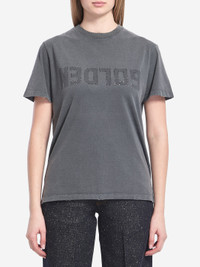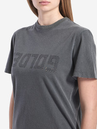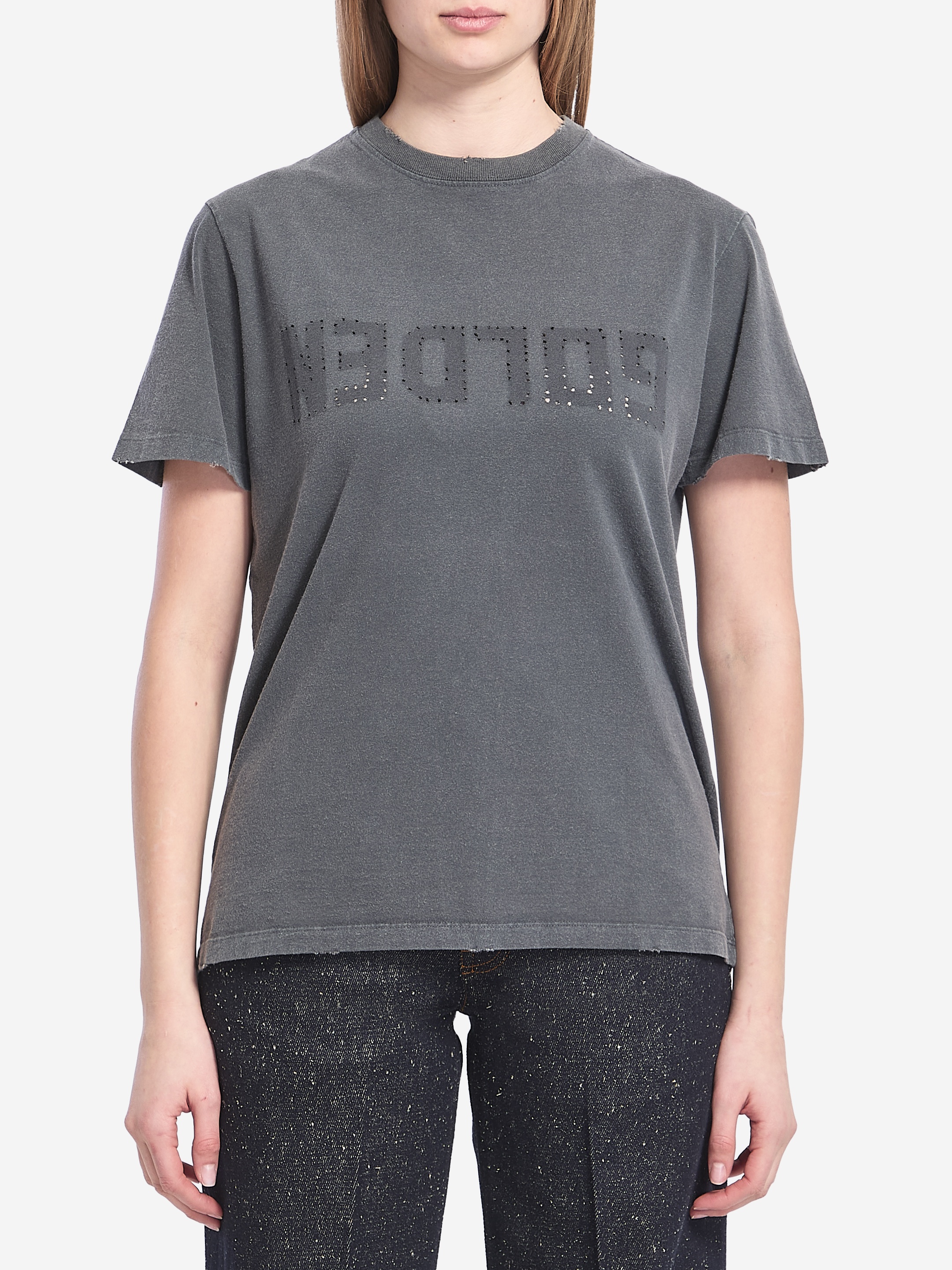 Anthracite grey cotton short-sleeve crewneck t-shirt with a distressed finish. It features a reversed Golden logo created with a distressed treatment on the chest, double gold stars on the back, and a ribbed crew neckline. Slim fit. The model is 179cm tall and wears a size S. More Info Product Number : 1446816 Product Code : GWP01220P00067160318 The model is 179cm tall and wears a size S. Composition : 100% cotton Made in: Italy