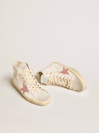 The Seventies, today: inspired by the world of basketball, the style of the Francy sneakers is updated with unexpected details and special finishes. These sneakers with a cream-colored nappa leather upper feature a powder-pink crocodile-print leather star and a cream-colored nappa leather heel tab. The ice-gray suede tongue and cream laces complete the look. DETAILS Item No. GWF00113.F005895.82660 - Cream nappa leather upper - Powder-pink crocodile-print leather star - Cream-colored nappa heel tab - Ice-gray suede tongue - Cream-colored laces - Vintage finish - Upper: 70% sheepskin leather, 30% cow leather - Lining: 57% cotton, 26% cow leather, 10% textile polyurethane, 5% polyester, 2% viscose - Sole: 100% rubber - Handmade - Made in Italy