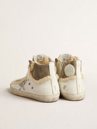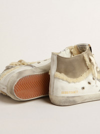 The Seventies, today: inspired by the world of basketball, the style of the Francy sneakers is updated with unexpected details and special finishes. Lined in soft beige shearling, this model with a white leather upper features dove-gray suede inserts, a silver glitter star and a white leather heel tab. The beige shearling trim detail and cream-colored laces add the finishing touch. DETAILS Item No. GWF00459.F004001.10876 - White leather and dove-gray suede upper - Silver glitter star - White leather heel tab - Beige shearling trim - Beige shearling lining - Cream laces - Vintage finish - Upper: 87% cow leather, 10% polyester, 2% polyethylene terephthalate, 1% cotton - Lining: 57% polyester, 35% cow leather, 4% polyamide, 4% textile polyurethane - Sole: 100% rubber - Handmade - Made in Italy