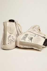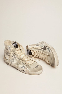 The Seventies, today: inspired by the world of basketball, the style of the Francy sneakers is updated with unexpected details and special finishes. This model with a white nappa leather upper decorated with all-over black lettering features ice-gray suede inserts, such as the star, which is plain with black lettering on the left sneaker and colored in black on the right, and the heel tab. And cream-colored laces add the finishing touch. DETAILS Item No. GWF00113.F002669.10220 - White nappa leather upper - Ice-gray suede star, plain with black lettering and colored in black - Ice-gray suede heel tab - Ice-gray suede toe - Ice-gray suede inserts - All-over contrasting black lettering - Contrasting black lettering on the foxing - Cream laces - Vintage finish - Upper: 63% sheepskin leather, 37% cow leather - Lining: 57% cotton, 43% cow leather - Sole: 100% rubber - Handmade - Made in Italy