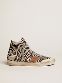 The Seventies, today: inspired by the world of basketball, the style of the Francy sneakers is updated with unexpected details and special finishes. This model, with a black and white zebra-print pony skin upper, features a tobacco-colored suede star and a black leather heel tab. The ice-gray laces with contrasting black logo add the finishing touch. DETAILS Item No. GWF00114.F002628.81554 - Zebra-print pony skin upper - Tobacco-colored suede star - Black leather heel tab - Ice-gray laces with contrasting black logo - Vintage finish - Upper: 87% cow leather, 13% textile polyurethane - Lining: 57% cotton, 43% cow leather - Sole: 100% rubber - Handcrafted - Made in Italy