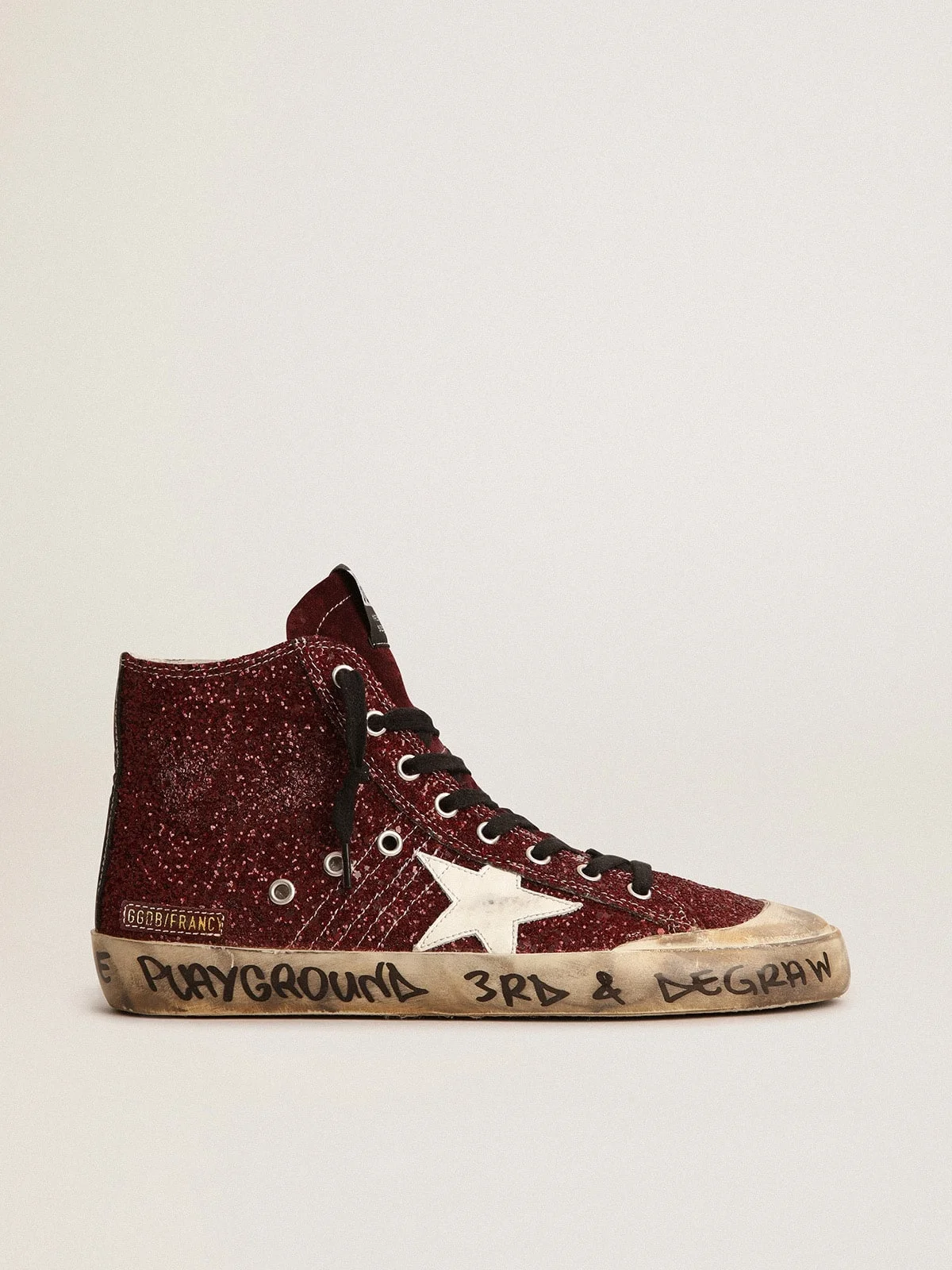 The Seventies, today: inspired by the world of basketball, the style of the Francy sneakers is updated with unexpected details and special finishes. These sneakers with a burgundy glitter upper feature a white leather star and black leather heel tab. And black laces add the finishing touch. DETAILS Item No. GWF00114.F003126.40420 - Burgundy glitter upper - White leather star - Black leather heel tab - Burgundy suede tongue - Black laces - Vintage finish - Upper: 28% polyethylene, 26% cow leather, 23% textile polyurethane, 12% cotton, 11% viscose - Lining: 46% cotton, 43% cow leather, 11% polyester - Sole: 100% rubber - Made in Italy - Handcrafted