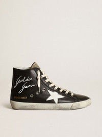 The Seventies, today: inspired by the world of basketball, the style of the Francy sneakers is updated with unexpected details and special finishes. This model with a black nappa leather upper features a white leather star and a dove-gray suede tongue. The white lettering with contrasting Golden Goose logo on the upper and cream-colored laces add the finishing touch. DETAILS Item No. GWF00113.F003385.90313 - Black nappa leather upper - White leather star - Dove-gray suede tongue - White lettering with contrasting Golden Goose logo on the upper - Cream-colored laces - Vintage finish - Upper: 81% sheepskin leather, 19% cow leather - Lining: 57% cotton, 43% cow leather - Sole: 100% rubber - Handmade - Made in Italy