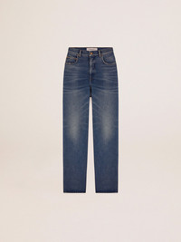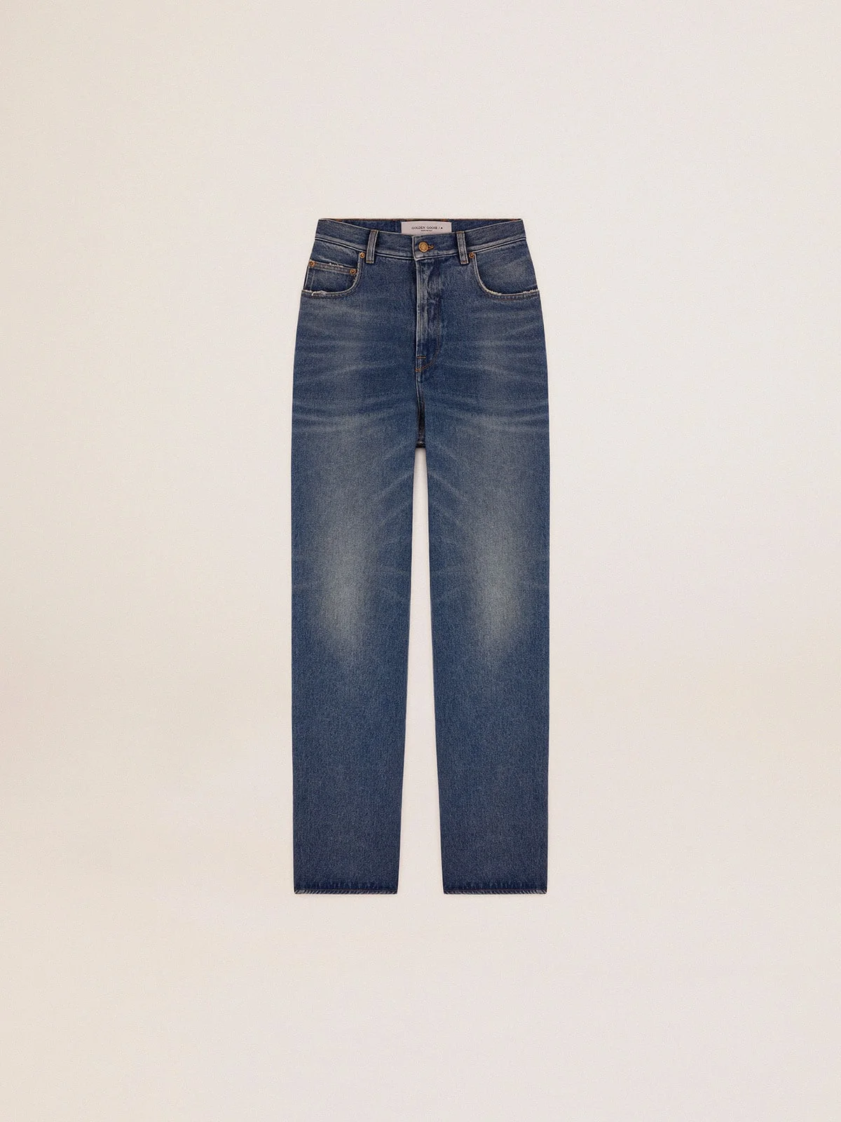 A unique, timeless collection that encompasses the essence of Golden Goose, designed to remain with you every day and accompany your highs and lows, come rain or shine. These medium-wash jeans have a wide leg and a detachable white patch with a finely embroidered letter G in red. DETAILS Item No. GWP00844.P000621.50100 - Color: blue - Double gold star on the back - Detachable white patch with embroidered red letter G - Wide leg - Five pockets - Main material: 100% cotton - Pocket lining: 65% polyester, 35% cotton - Made in Italy The model is 177 cm tall and is wearing a size 27 (IT).