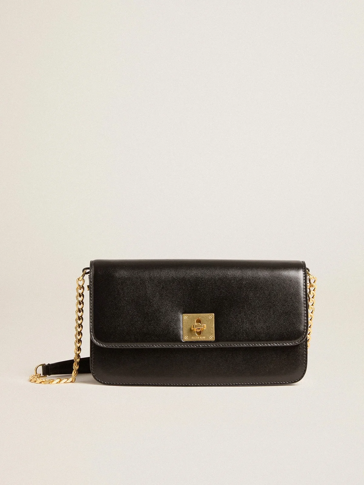 Capturing the essence of fascinating journeys and indelible family moments, the Gioia bag is a tapestry of stories waiting to be discovered. In black boarded leather, this model features a lock closure with gold-tone buckle and gold-colored chain. The zippered inside pocket for all your memories and concealed outside pocket to hold your secrets add the finishing touch. DETAILS Item No. 8050235736665 - Color: black - Lock closure with gold-tone buckle with side buttons - Triple inside pocket - Inside pocket with gold-tone zip closure - Inner card holder - Concealed pocket on the back - Logo on the back - Gold-tone chain with attachable leather handle - Main material: 100% cow leather - Lining: 100% sheepskin leather - Size: 24 x 13 x 6.5 cm - Chain length: 106 cm - Handle on chain shoulder strap: 2.2 cm - Service shoulder strap: 1.2 cm