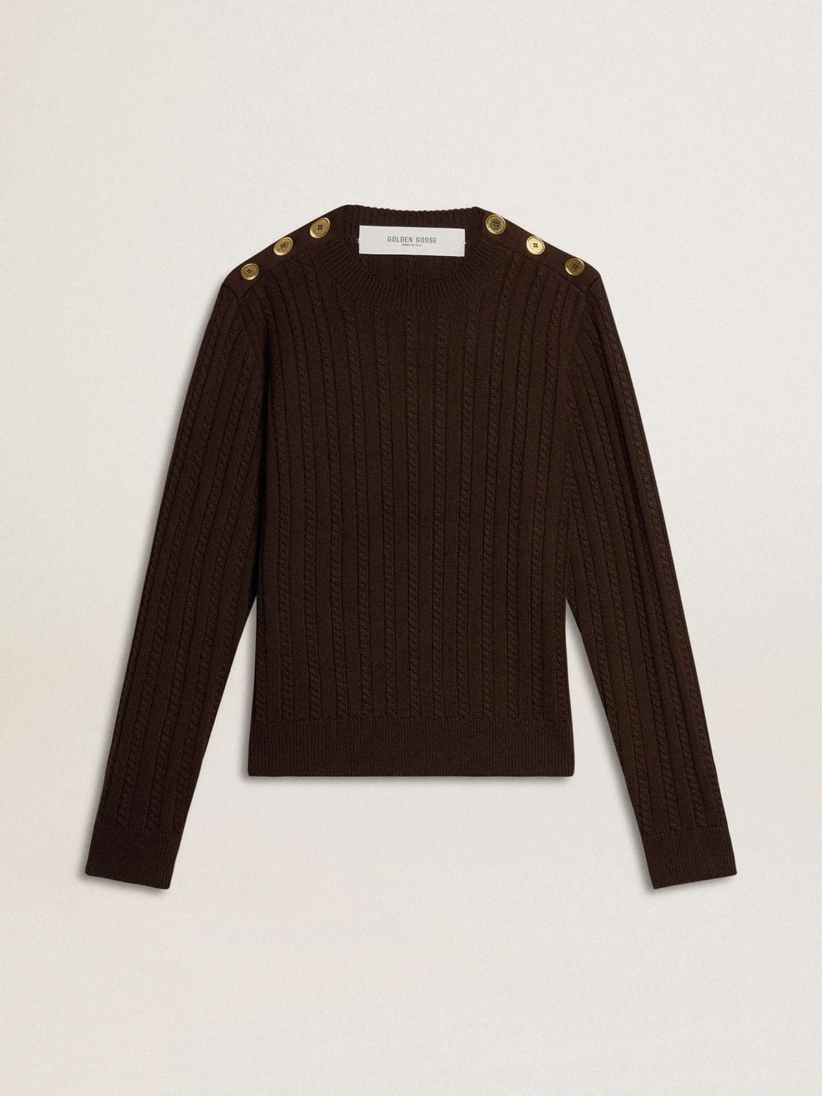 The second drop in the Fall/Winter 25 collection unfolds like a relaxed and refreshing journey, woven into the fabric of each and every piece. In a brown wool blend, this regular-fit crew-neck sweater features gold buttons on the shoulders and a tone-on-tone vertical braided pattern. The micro-ribbed trim and two little stars on the back add the finishing touch. DETAILS Item No. GWP02467.P002110.90108 - Journey Collection - Color: brown - Regular fit - Round neck - Gold buttons embroidered on the shoulders - Tone-on-tone vertical braided pattern - Micro-ribbed trims - Main material: 90% virgin wool, 10% polyamide - Made in Italy The model is 177 cm tall and is wearing a size S.
