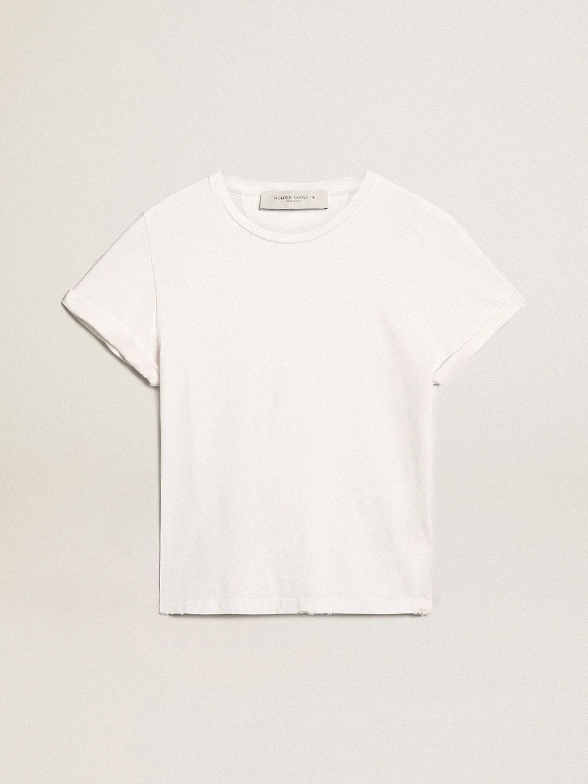 A unique, timeless collection that encapsulates the Golden Goose DNA, designed to remain with you every day, through thick and thin, come rain or shine. In white cotton, this regular-fit T-Shirt features a distressed treatment. DETAILS Item No. GWP01220.P000638.10363 - Golden Collection - Color: white - Double gold star on the back - Regular fit - Short sleeves - Distressed finish - Main material: 100% cotton - Made in Italy The model is 177 cm tall and is wearing a size S.