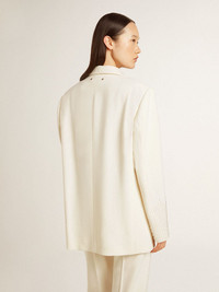 Inspired by the electric energy of the Nineties, the collection celebrates the limitless power of shared dreams. Moved by passion, each design captures the meaning of togetherness and the power of music. This white single-breasted wool blend jacket features white silk-effect lapels and an oversized fit. The handmade glass bead embroidery on the end of the sleeves and the closure with two white buttons covered with silk add the finishing touch. DETAILS Item No. GWP02069.P001954.20103 - Journey Collection - Color: white - Oversized fit - White silk lapels - Handmade bead embroidery on the sleeves - Two front pockets - Closure with two buttons covered with white silk - Main material: 70% viscose, 30% virgin wool - Lapel material: 100% polyester - Made in Italy The model is 177 cm tall and is wearing a size 40.