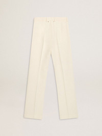 Inspired by the electric energy of the Nineties, the collection celebrates the limitless power of shared dreams. Moved by passion, each design captures the meaning of togetherness and the power of music. Made of a wool blend, these loose worn-white pants feature a tailored cut. The inner belt and central closure with metal hook add the finishing touch. DETAILS Item No. GWP02266.P001619.20103 - Journey Collection - Color: white - Double star on the back - Loose fit - Straight leg - Inner belt - Closure with central metal hook - Main material: 70% viscose, 30% virgin wool - Pocket lining: 100% cotton - Made in Italy The model is 177 cm tall and is wearing a size 40.