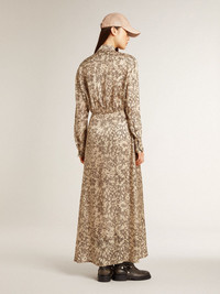 A collection inspired by the harmony of nature, where every detail flows with ease. Made of a silk blend, this midi-length dress features a floral print and long sleeves. And logoed horn buttons add the finishing touch. DETAILS Item No. GWP02156.P001913.15676 - Journey Collection - Color: beige and black - Double star on the back - Regular fit - Logoed horn buttons - Midi length - Floral print - Main material: 75% viscose, 25% silk - Made in Italy The model is 177 cm tall and is wearing a size40.