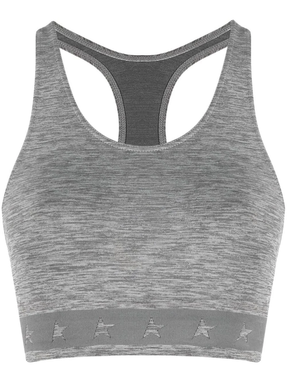 logo-underband racerback crop top Golden Goose takes a sporty approach with this cropped top, constructed in a racerback design. The grey-hued garment is adorned with the brand's signature star logo for a recognisable touch. Made in Italy Composition Polyamide 44%, Polypropylene 35%, Polyester 16%, Spandex/Elastane 5% SIZE & FIT Model measurements Height 5 ft 10 in(1.79 m) Bust/Chest 31.49 in(80 cm) Hips 35.03 in(89 cm) Waist 23.62 in(60 cm) FittingInformation This piece fits true to size. We recommend you get your regular size Cut for a close fit Made with a mid-weight stretch fabric Washing instructions Machine Wash