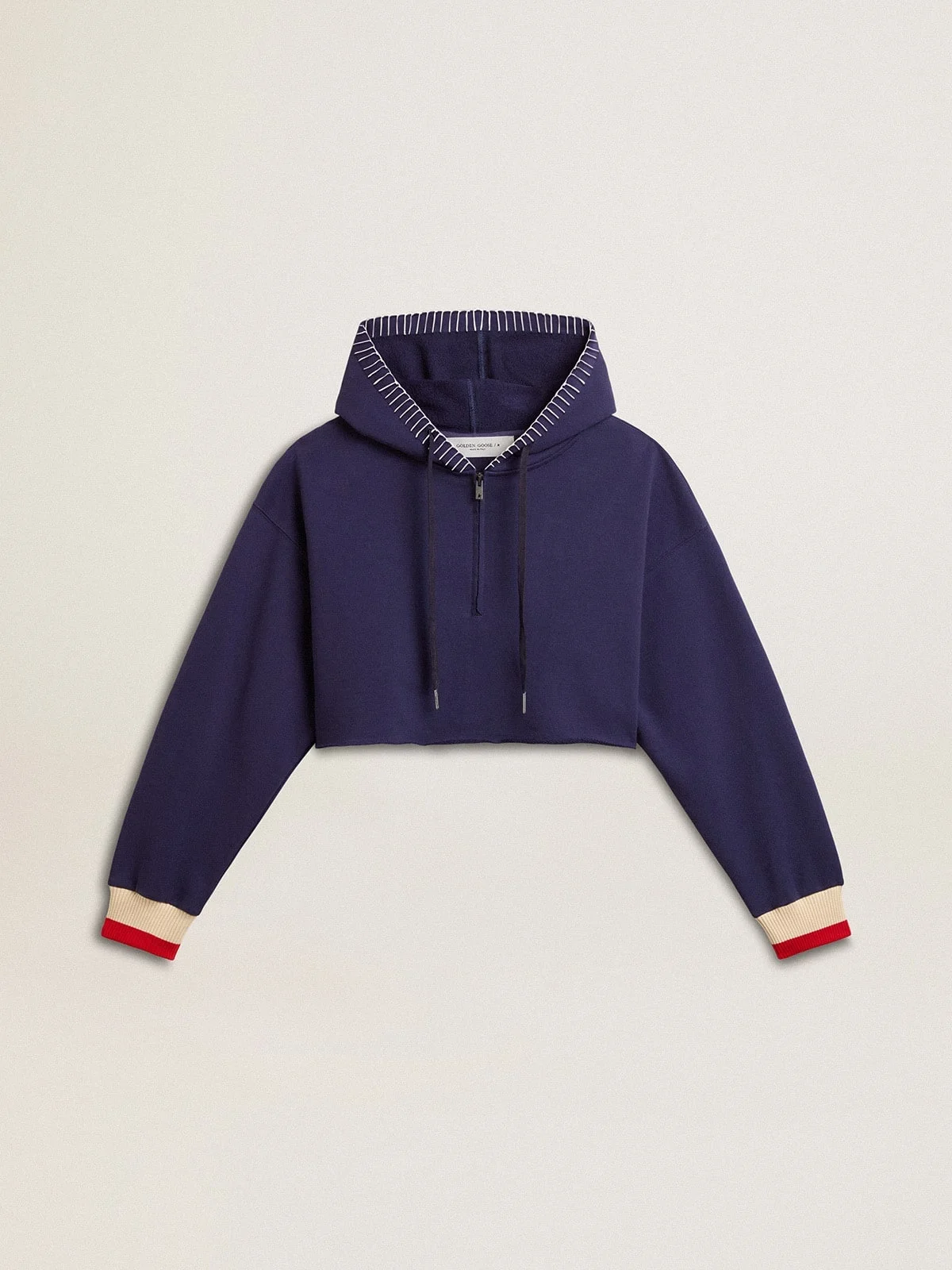 A love story to our home, Marghera. Where everything began. Our latest collection reflects the spirit of our birthplace, its contrasts, industrial soul, and manufacturing landscapes, weaving together inspirations from both the vibrant energy of workwear and the refined essence of traditional tailoring. With a half-zip on the front, this cropped sweatshirt in eclipse-blue cotton features an embroidered hood and embroidered patches on the back in double felt and nylon material. The cuffs and hem in striped cotton knit add the finishing touch. DETAILS Item No. GWP01225.P001636.50878 - Journey Collection - Color: eclipse blue - Double gold star on the back - Half zip on the front - Cropped fit - White logo on the back - Hood with hand-sewn embroidery - Striped cuffs and hem - Embroidered patches - Distressed finish - Main material: 100% cotton - Made in Italy The model is 177 cm tall and is wearing a size S.
