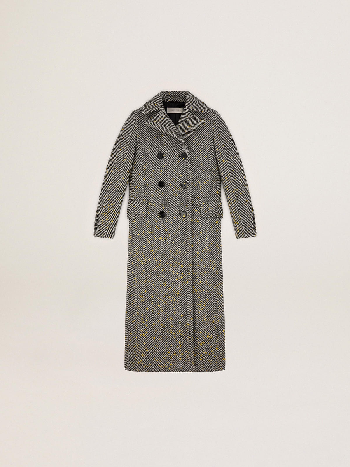 Women’s long herringbone coat with yellow details