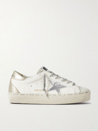 Golden Goose fuses Southern Californian skate culture with Italian craftsmanship. These 'Hi Star' sneakers have been made from smooth leather that's subtly hand-distressed for a lived-in feel. Trimmed with suede, they have metallic heel tabs and snake-effect star appliques. Size & Fit - Fits true to size, take your normal size - Only available in full sizes, go up to the nearest whole size if you take a half size - Italian sizing Details & Care - Rubber sole measures approximately 20mm/ 1 inches - White leather, silver snake-effect leather, gold metallic leather (Cow), gray suede - Lace-up front