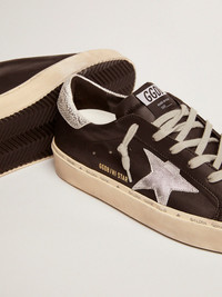 Double height and iconic design: inspired by our Super-Star sneakers, the Hi Star sneakers feature double foxing, embellished with hand lettering. This black leather model features silver laminated leather details such as the monochrome-effect star and animal-print heel tab. And ice-gray laces add the finishing touch. DETAILS Item No. GWF00118.F000328.90179 - Color: black - Silver laminated leather star - Animal-print silver laminated leather heel tab - Ice-gray laces - Vintage finish - Upper: 95% cow leather, 5% sheepskin leather - Lining: 49% cow leather, 45% cotton, 4% polyamide, 2% textile polyurethane - Sole: 100% rubber