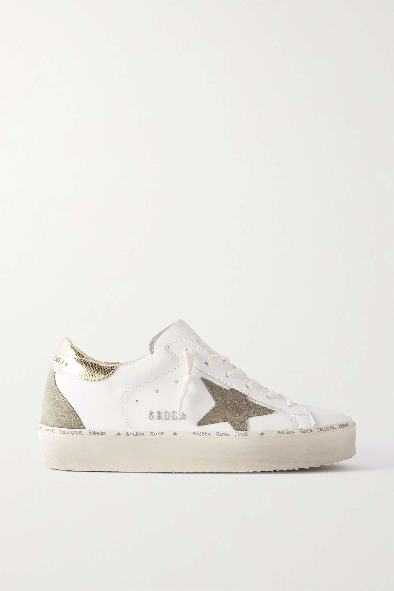 EDITORS'NOTES Golden Goose combines Southern Californian skate culture with Italian handcraft, and these 'Hi Star' sneakers are the latest covetable iteration. They're made from smooth white leather with suede trims and signature distressing. The gold lizard-effect leather heel tabs shimmer as you walk. SIZE & FIT - Fits true to size, take your normal size - Italian sizing DETAILS & CARE - Rubber sole measures approximately 25mm/ 1 inch - White leather, gold lizard-effect leather (Calf), beige suede - Lace-up front