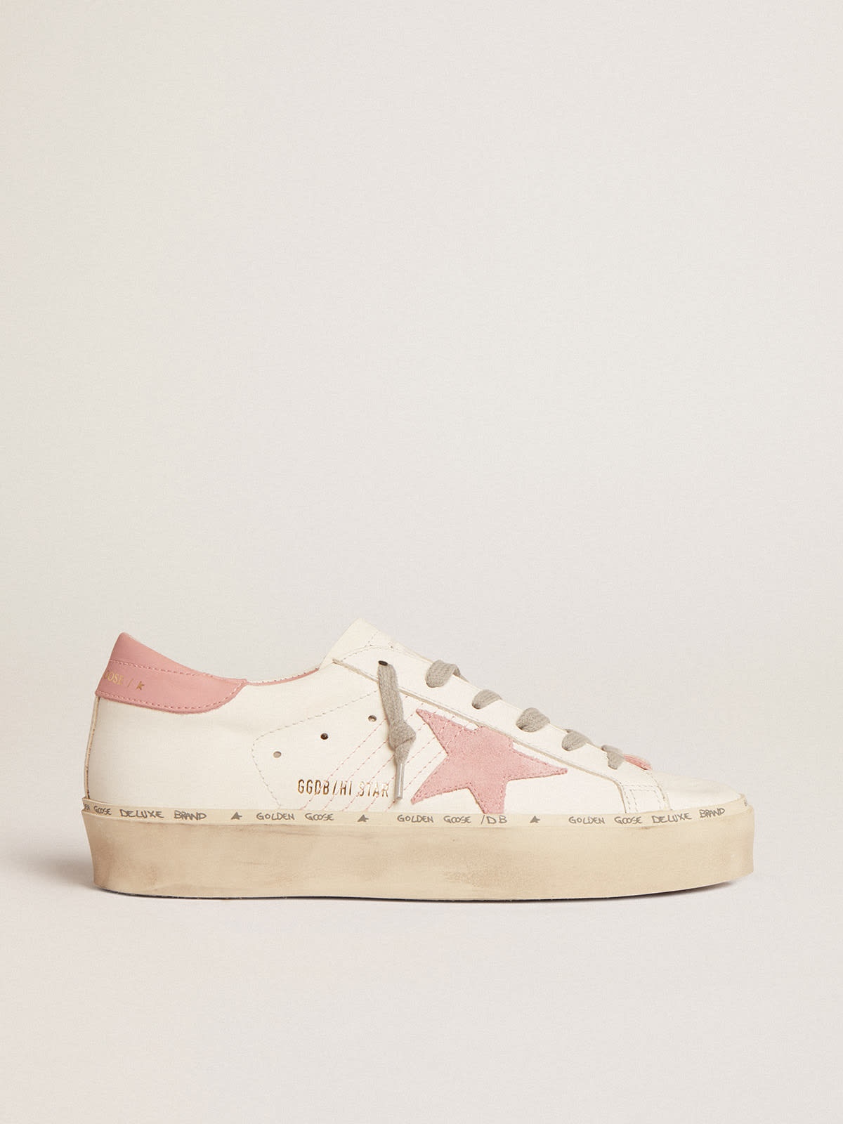 Double height and iconic design: inspired by our Super-Star sneakers, the Hi Star sneakers feature double foxing, embellished with hand lettering. This model in white leather features old rose details, such as the suede star and leather heel tab. And ice-gray laces add the finishing touch. DETAILS Item No. GWF00118.F004723.11202 - Color: white - Old rose suede star - Old rose leather heel tab - Ice-gray laces - Vintage finish - Upper: 100% cow leather - Lining: 49% cow leather, 41% cotton, 7% polyester, 3% textile polyurethane - Sole: 100% rubber - Handmade - Made in Italy