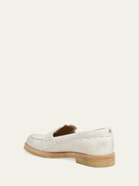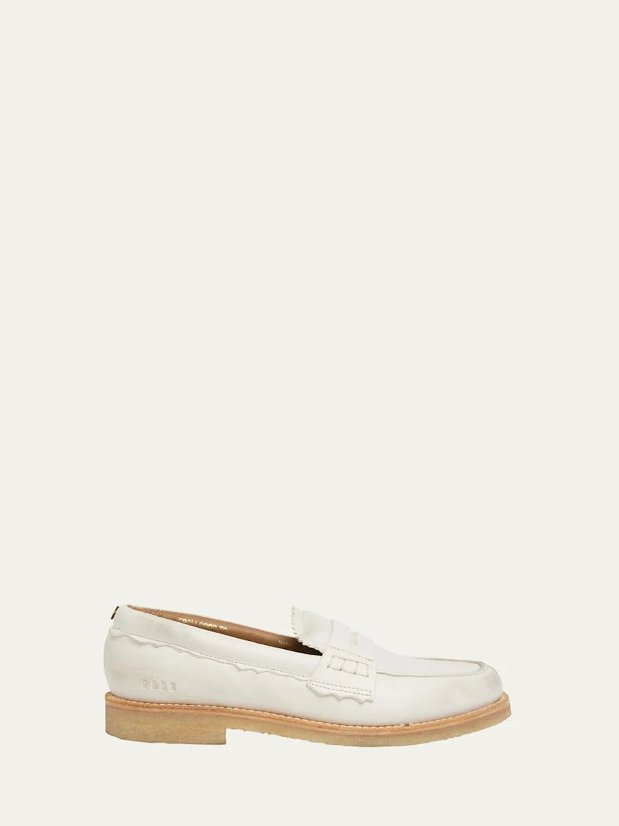 Golden Goose "Jerry" distressed leather penny loafers. 0.75 in / 20 mm flat heel. Round moc toe. Notched vamp. Slipon style. Rubber outsole. Lining: Leather. Made in Italy.