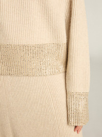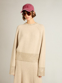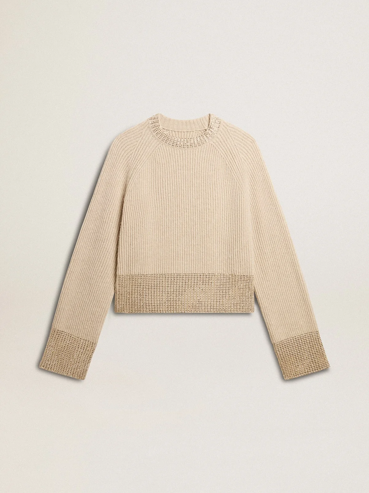 A love story to our home, Marghera. Where everything began. Our latest collection reflects the spirit of our birthplace, its contrasts, industrial soul, and manufacturing landscapes, weaving together inspirations from both the vibrant energy of workwear and the refined essence of traditional tailoring. Made of beige ribbed wool, this women's boxy sweater features a hotfix application of light golden square crystals on the collar, cuffs and hem of the garment. DETAILS Item No. GWP01961.P001707.15609 - Journey Collection - Color: beige - Double star on the back - Boxy fit with raglan sleeves - Square hotfix crystal decoration - Main material: 100% wool - Sleeve material: 100% wool - Made in Italy The model is 177 cm tall and is wearing a size S.
