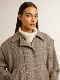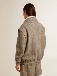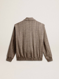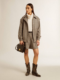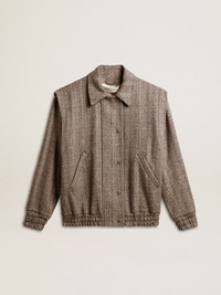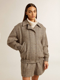 A love story to our home, Marghera. Where everything began. Our latest collection reflects the spirit of our birthplace, its contrasts, industrial soul, and manufacturing landscapes, weaving together inspirations from both the vibrant energy of workwear and the refined essence of traditional tailoring. This women’s bomber jacket in herringbone wool features a double fastening: with press studs and with an inner metal zip. The elasticated cuff adds the finishing touch. DETAILS Item No. GWP01952.P001617.82696 - Journey Collection - Color: ecru brown - Double star on the back - Snap button fastening - Fastening with concealed metal zip - Two pockets on the front - Oversized fit - Elasticated cuff - Jacquard viscose lining - Main material: 69% wool, 13% linen, 13% polyamide, 3% other fibers, 2% polyester - Lining material: 100% viscose - Made in Italy The model is 177 cm tall and is wearing a size 40.