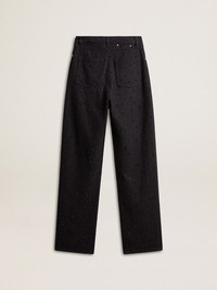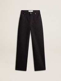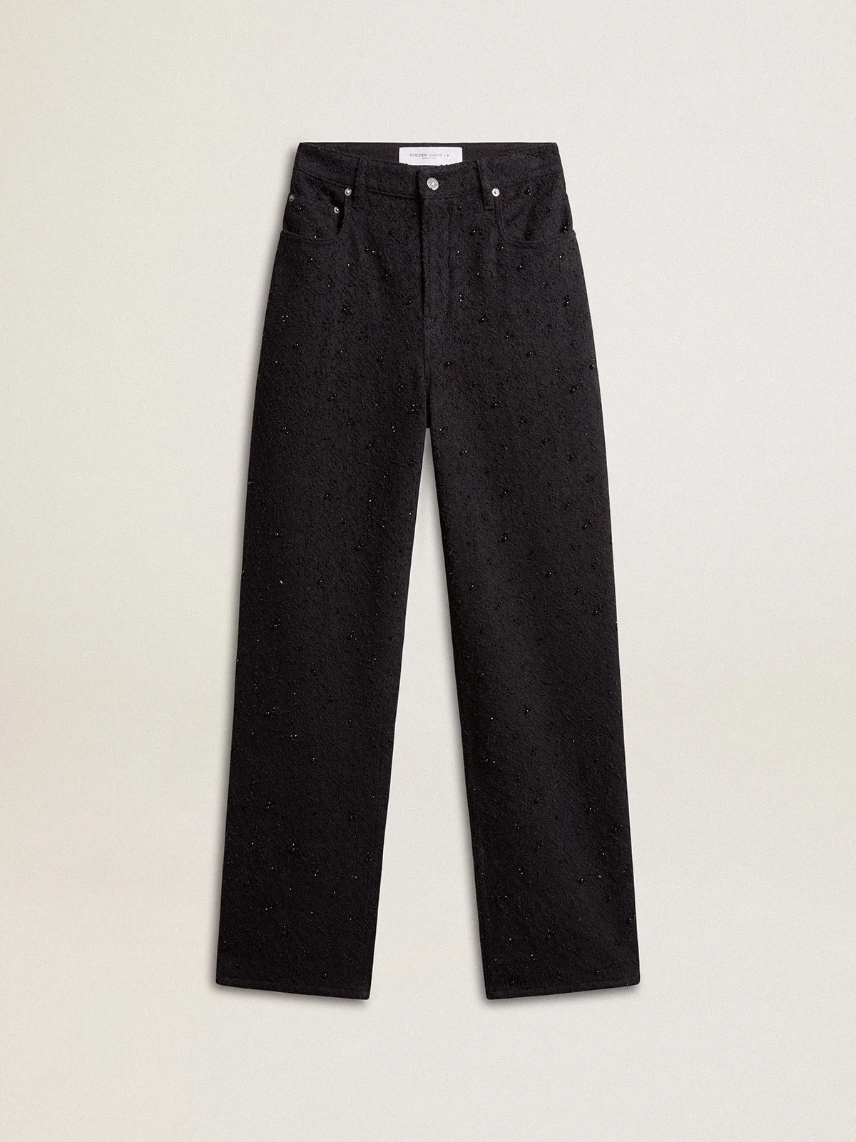 A love story to our home, Marghera. Where everything began. Our latest collection reflects the spirit of our birthplace, its contrasts, industrial soul, and manufacturing landscapes, weaving together inspirations from both the vibrant energy of workwear and the refined essence of traditional tailoring. These black-colored denim pants feature crystals and stones in different sizes. The metal detail and two little stars on the back add the finishing touch. DETAILS Item No. GWP00844.P001677.90100 - Journey Collection - Color: black - Double star on the back - Black-colored crystals and stones - Metal details - Pocket lining: 65% polyester, 35% cotton - Made in Italy The model is 177 cm tall and is wearing a size 40.