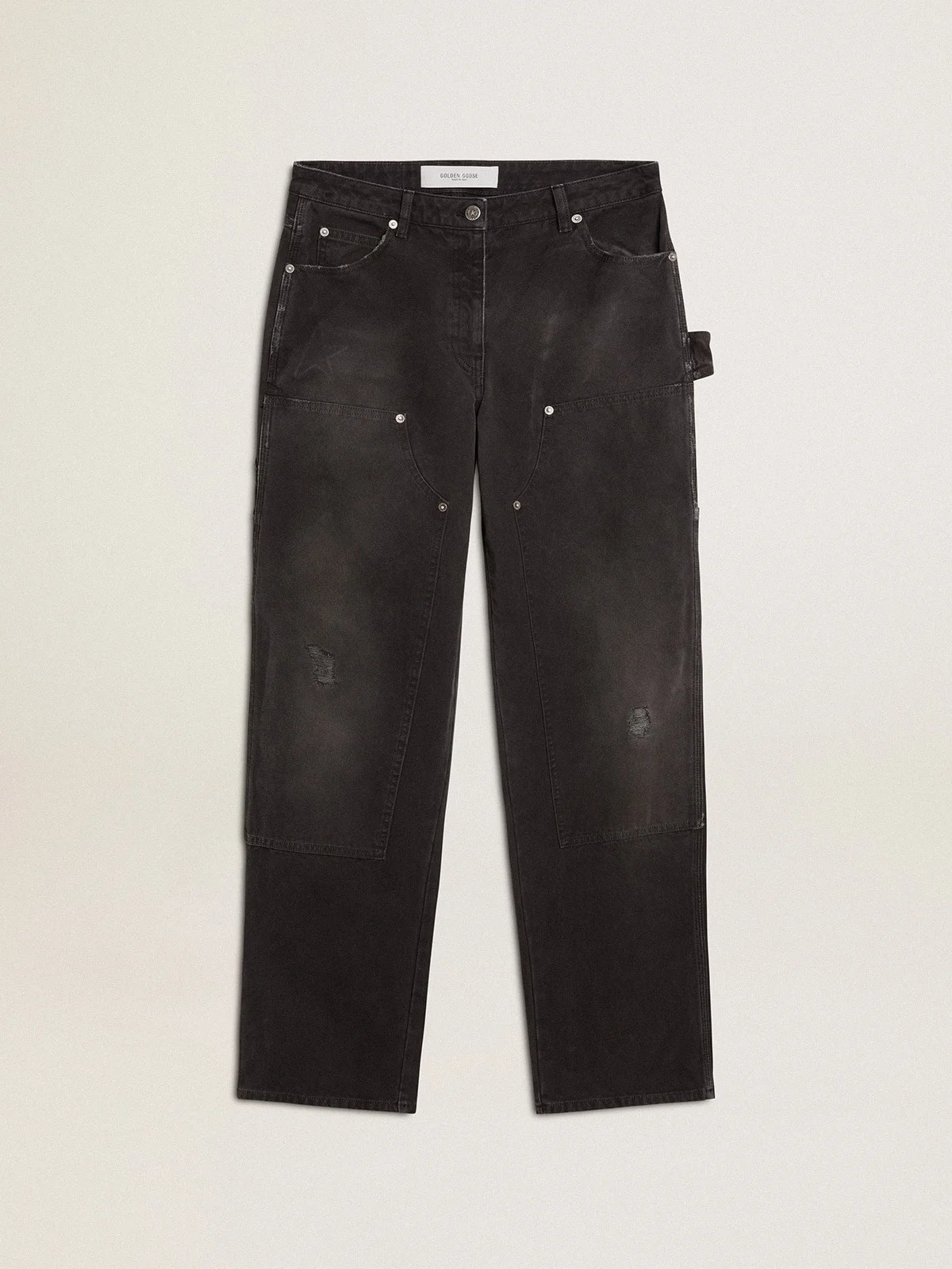 Inspired by the electric energy of the Nineties, the collection celebrates the limitless power of shared dreams. Moved by passion, each design captures the meaning of togetherness and the power of music. In black cotton, these jeans have a distressed effect and deliberately worn fabric. The front patches with studs and the tone-on-tone star under the right pocket add the finishing touch. DETAILS Item No. GWP01942.P001921.90100 - Journey Collection - Color: black - Double star on the back - Studded details - Five pockets - Front patches - Tone-on-tone star under the right pocket - Main material: 100% cotton - Pocket lining: 65% polyester, 35% cotton - Made in Italy The model is 177 cm tall and is wearing a size 40.