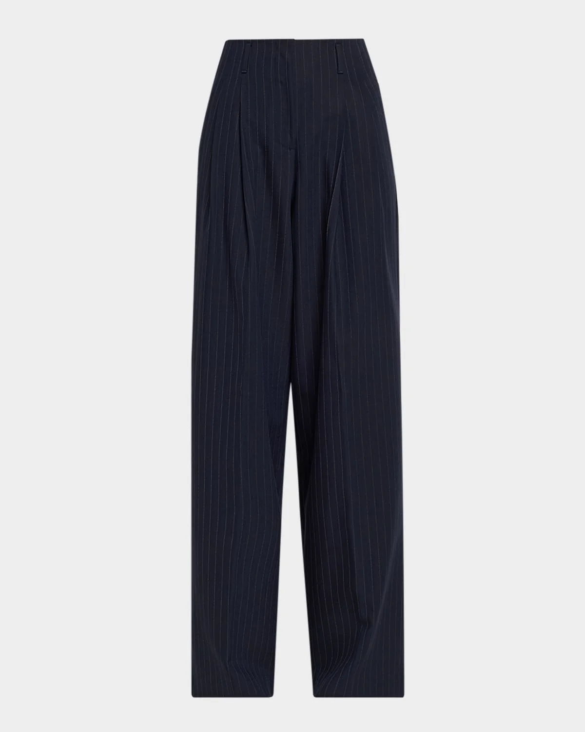 From the Golden Goose "Journey" collection, these pants are crafted from a pinstriped wool blend. High rise Pleated front Side pockets; back flap pockets Wide legs Full length Hook/zip fly; back belt loops Virgin wool/cotton Dry clean only Made in Italy