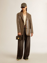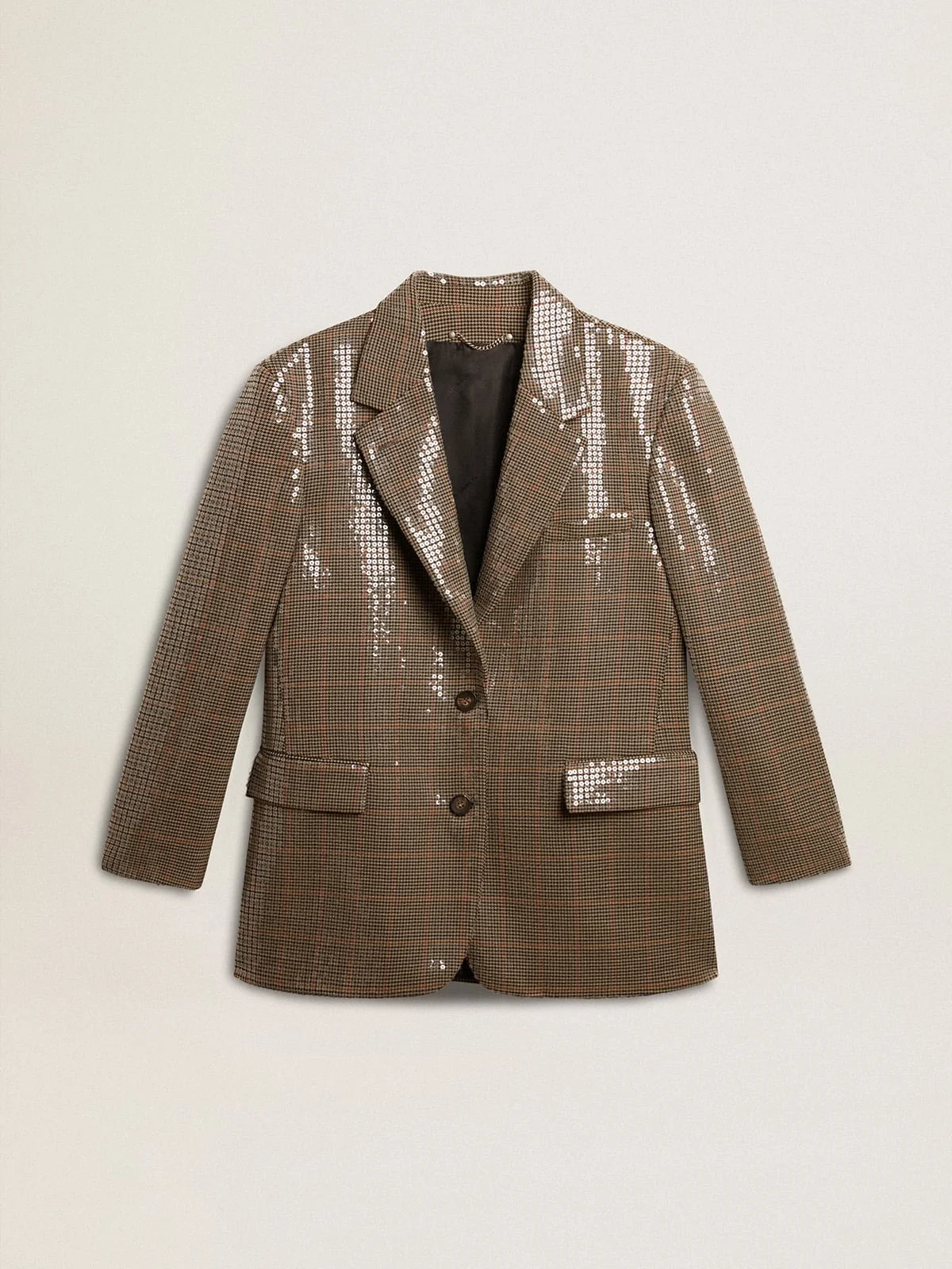 A love story to our home, Marghera. Where everything began. Our latest collection reflects the spirit of our birthplace, its contrasts, industrial soul, and manufacturing landscapes, weaving together inspirations from both the vibrant energy of workwear and the refined essence of traditional tailoring. In a houndstooth pattern, this women's boyfriend fit jacket features all-over sequin embroidery. The logoed jacquard viscose lining adds the finishing touch. DETAILS Item No. GWP01890.P001621.82699 - Journey Collection - Color: beige, black and red - Double star on the back - Boyfriend fit - Three front pockets - All-over sequins - Logoed horn button fastening - Main material: 100% wool - Lining material: 100% viscose - Pocket lining: 100% cotton - Made in Italy The model is 177 cm tall and is wearing a size 40.