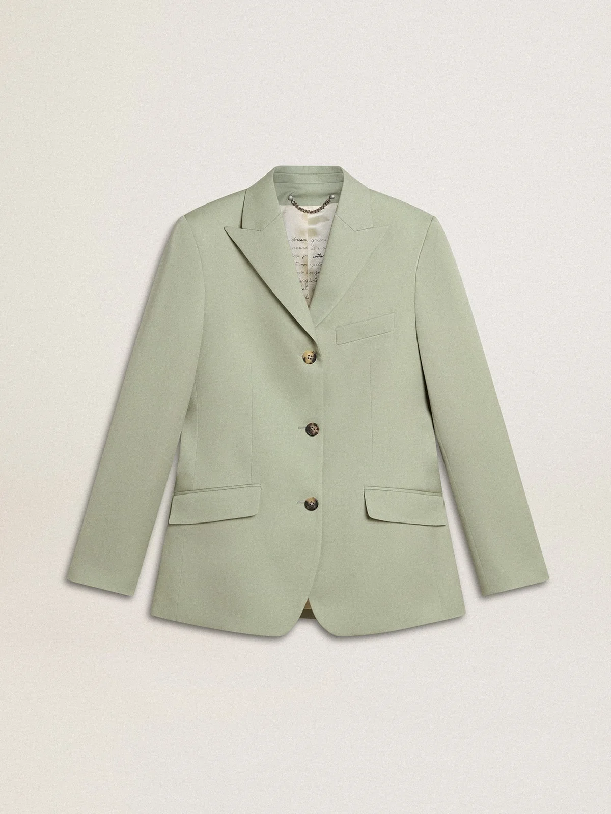 Embracing the essence of the season, this collection radiates vitality and freedom, combining airy elegance with dynamic sparks of energy. This women's blazer in sage-green pure virgin wool features peak lapels and a slim fit. The closure with three logoed horn buttons, the printed lining and the two pockets are the finishing touches that make this jacket unique and inimitable. DETAILS Item No. GWP02180.P001965.35375 - Journey Collection - Color: sage green - Slim fit - Peak lapels - Two pockets - Fastening with three logoed horn buttons - Printed lining - Double star on the back - Main material: 100% virgin wool - Lining: 100% viscose - Made in Italy The model is 177 cm tall and is wearing a size 40.