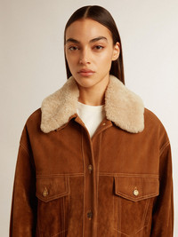A love story to our home, Marghera. Where everything began. Our latest collection reflects the spirit of our birthplace, its contrasts, industrial soul, and manufacturing landscapes, weaving together inspirations from both the vibrant energy of workwear and the refined essence of traditional tailoring. This women's jacket in split leather with corduroy-effect laser detailing features a detachable collar in shearling merino wool. The lightly padded quilted lining with logo adds the finishing touch. DETAILS Item No. GWP02039.P001671.55194 - Journey Collection - Color: tobacco - Double star on the back - Regular fit - Four front pockets - Detachable shearling collar - Quilted lining with logo - Antique gold button fastening - Main material: 100% cow leather - Contrasting material: 100% cow leather - Padding: 100% polyester - Collar material: 100% sheepskin leather - Lining material: 100% viscose - Pocket lining: 100% cotton - Made in Italy The model is 177 cm tall and is wearing a size 40.